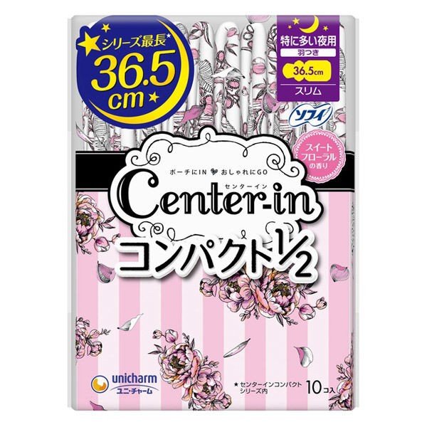 お尻をすっぽり包み込み、特に多い夜でも後ろモレも安心のスリムナプキン、センターイン コンパクト1/2です。特に多い夜もモレ安心なのが嬉しいですね。持ち歩きにベストな1/2コンパクトサイズで、おしゃれにお出かけできるスリムタイプの生理用ナプキン。