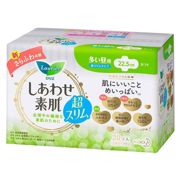 モワッとこもるムレはかゆみやかぶれの不安にもなります。ロリエ しあわせ素肌 はムレを抑えて素肌をやさしくいたわります。スーッと空気が通るエアスルーでムレがこもらず肌にやさしく、また独自の凹凸シートで肌とナプキンの間を空気がスーッムレにくく肌にベタッとくっつきにくいです。さらに全面通気性バックシート採用でしっかり吸収して肌さらり、モレを気にせず過ごせます。