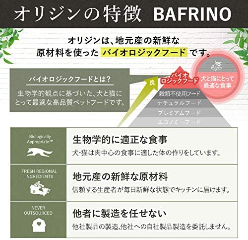 特徴①原材料の鶏肉は66%と高配合!たっぷりの鶏生肉と、栄養価を損なうことなくゆっくりと時間をかけて脱水したディハイドレイテッドチキン(脱水鶏肉)を使用特徴②34種類もの野菜、フルーツ、ハーブを配合。さらに、不足しがちなDHAやEPAを補うために、豊富な栄養素と強い生命力を持つ南極オキアミを配合特徴③AAFCO(米国飼料検査官協会)及びFEDIAF(欧州ペットフード工業会連合)の定める規則を満たしています。