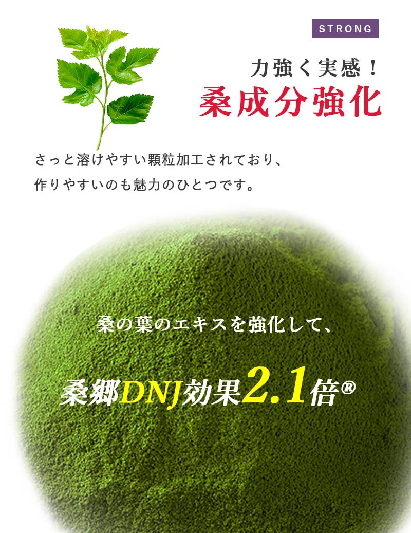 かつて養蚕が盛んだった頃、桑郷本社のある山梨県市川三郷町発祥の、葉が大きく葉肉の厚い『一瀬桑』が養蚕に不可欠な桑の最良品種として全国に広がり、日本の養蚕を支えました。今は、人々の健康に役立てようと、養蚕農家の協力を得て、丹精込めて作っています。また、桑茶は毎日飲むもの、飲み難くては続きません。ひと手間かけて緑茶と同じ方法で製茶加工し、蒸して、じっくりともみ上げ、時間をかけてじんわりと乾燥させ心を込めて作り上げました。こだわりの製法によって、桑の葉の緑色の美しい色が維持され、まろやかでサラリと飲めると高い評価をいただいています。桑の栽培から桑の葉茶の製造、販売まで一貫して自社で手がけており、全ての過程において、責任とプライド、何より愛情が込められています。この「ハンさんのおいしい桑茶 Strong」タイプは、桑の葉のエキスを強化して、糖質コントロール成分の効果2.1倍!さらに緑茶カテキンを配合しWパワーで元気な毎日を。青臭さが残ってしまう桑の葉茶従来の日陰干し製法ではなく、丁寧に蒸して揉みあげる伝統の『日本茶製法』で仕上げることにより、甘みがありまろやかでクセの無い桑の葉茶が出来上がるのです。