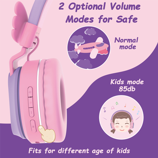 耳元の羽根が愛らしくユニークなデザインの無線タイプヘッドセットで、パステル基調の4種類のカラーが選べます。音量がスイッチによって、ノーマルモードとキッズモード(103dB/85dB)を切り替えられるようになっていて、大人も使用可能となっています。