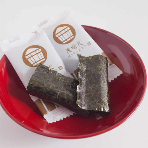 八丁味噌の味をつけたチーズ生地には、粉あられが入っていて、風味がバツグン。海苔で巻いて香りをお楽しみ下さい。手軽にお茶請けやおつまみとしてお召し上がりいただけます。