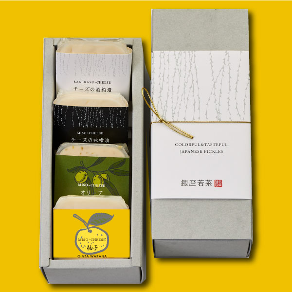 お漬物の名店、銀座若菜の「銀座のチーズ」の中から、人気のチーズを詰め合わせたアソート。「チーズの味噌漬」「酒粕漬」「柚子チーズ(味噌漬)」「オリーブチーズ(味噌漬)」の4種類です。そのままクラッカーに塗ったり、フルーツに盛り付けたりしてオードブルにもなりますし、海苔巻きやお煎餅に加えるアレンジも合いますよ。