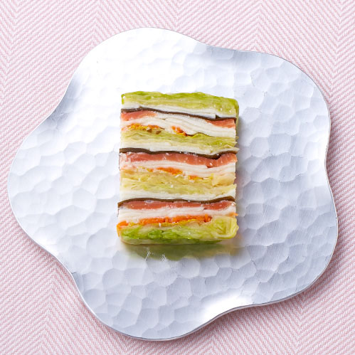 華やかな色合いのミルフィーユ状になったお漬物。オードブルにもお酒のアテにも合う一品です。甘玉きゃべつ、千枚かぶらなどを使った冬野菜とお昆布でしめた鮭を重ねて、糀床に漬け込んであります。冬の季節限定生産のごちそうキャベツを、温かいお料理と共に。