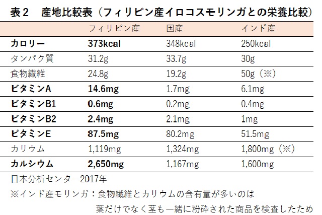 国産のモリンガや、インド産のモリンガと比較すると、原種のモリンガならではの栄養価の高さが際立ちます。(表2参照)