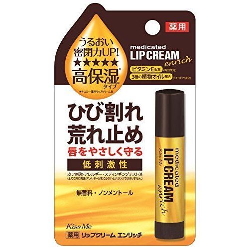ひび割れ、荒れ止め、唇をやさしく守る キスミー 薬用リップクリーム エンリッチ!2つの有効成分と3種の植物オイル配合で、唇にうるおいを与え、乾燥から守ってくれます。低刺激性でデリケートな唇にもやさしいつけ心地。