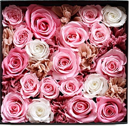 箱いっぱいにバラとカーネーションが広がるIPFAのプリザーブドフラワーbox!1輪1輪異なる表情を持つため、造花のように全てが同じではありません。オリジナリティがあふれています。化粧箱に入れられている為、そのままお部屋に飾るだけでOK!