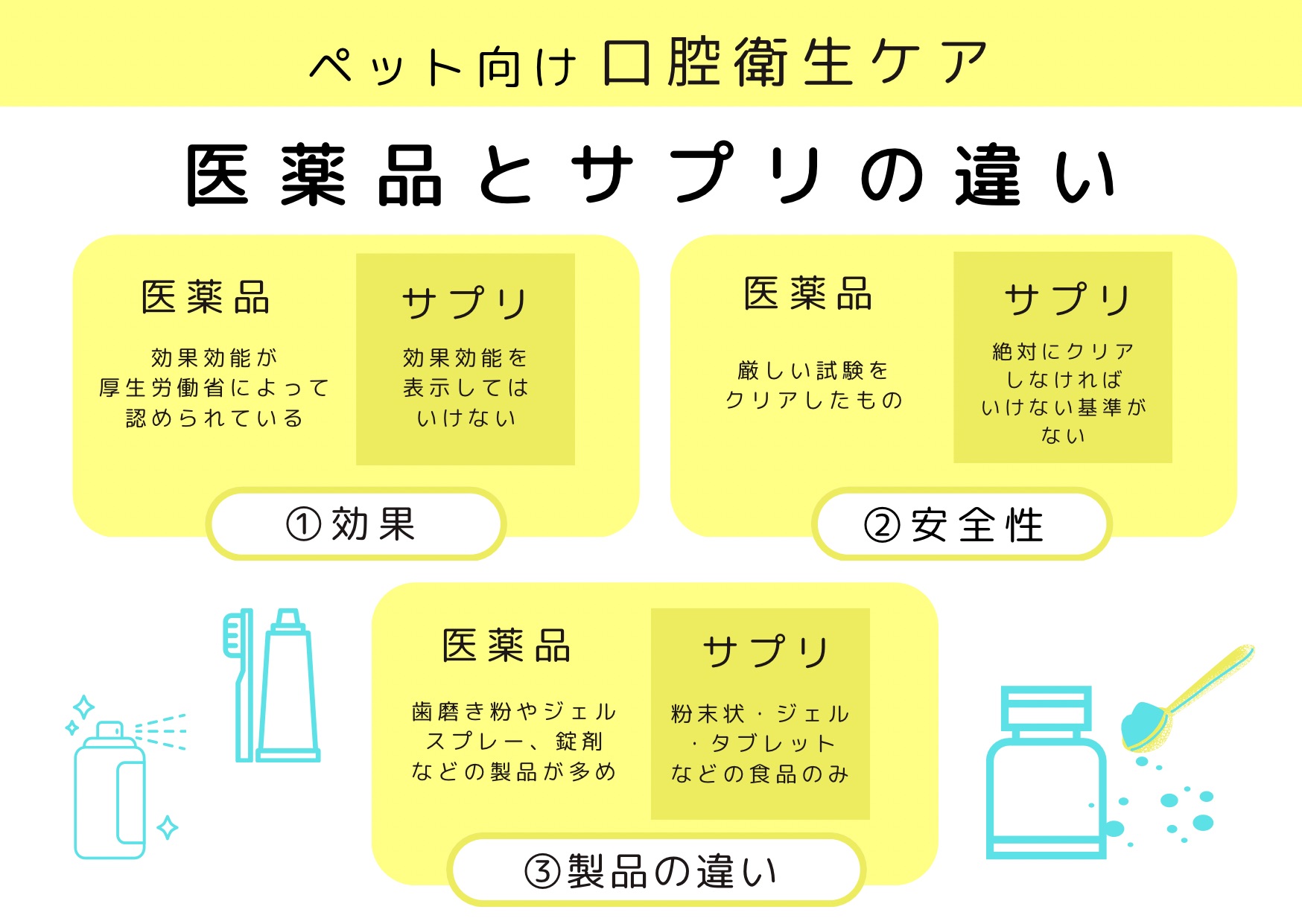 3つ目に、ペット用口腔ケアにおける医薬品とサプリメントの違いとして、製品の違いがあります。