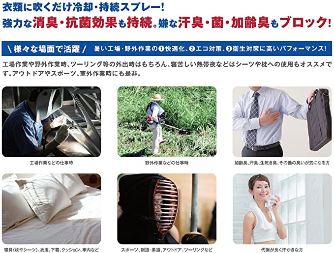 | メントール配合 | ◯あり | 抗菌・除菌効果 | ◎両方効果あり | 消臭効果 | ◯あり | 容量 | ◯500ml以上 | 冷感持続時間 | ◎90分以上 |